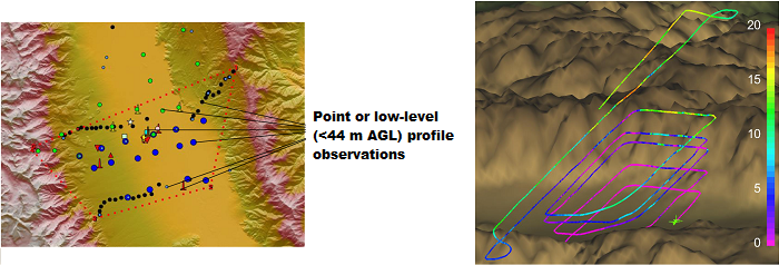 The Terrain-induced Rotor Experiment (T-REX, Grubišić et al. 2008) was designed to study mountain wave and rotor activity in Owens Valley, California to the lee of the southern Sierra Nevada. While the study area included a micronet of surface stations, temperature loggers, and soil moisture sensors, there was also dense coverage by instruments with results that can be rendered in a 3D display. These include three 44-m flux towers and two boundary-layer wind profilers, two radiosonde sites, one aerosol lidar and two with Doppler capability, and up to three research aircraft at different levels.