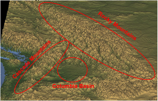 One of many ways to divide the subjects of mountain meteorology is to consider concepts as: 1) upslope/upwind, 2) downslope/downwind, and 3) enclosed valleys/basins. For ease of travel in VR, these three regions should all be located a relatively short distance from each other. This could be done by having a large, linear mountain range separating areas 1) and 2) in the northern half of the domain. In the southern half, a second mountain range could intersect the first at a 45-90 degree angle creating a large interior basin (3) if higher terrain also exists to the south. Such configurations can be found in actual topography, such as the area from Washington to Montana and southern British Columbia to southern Alberta, which includes the Rocky and Cascade Mountains and Columbia Basin as described prior (Billings et al. 2016).